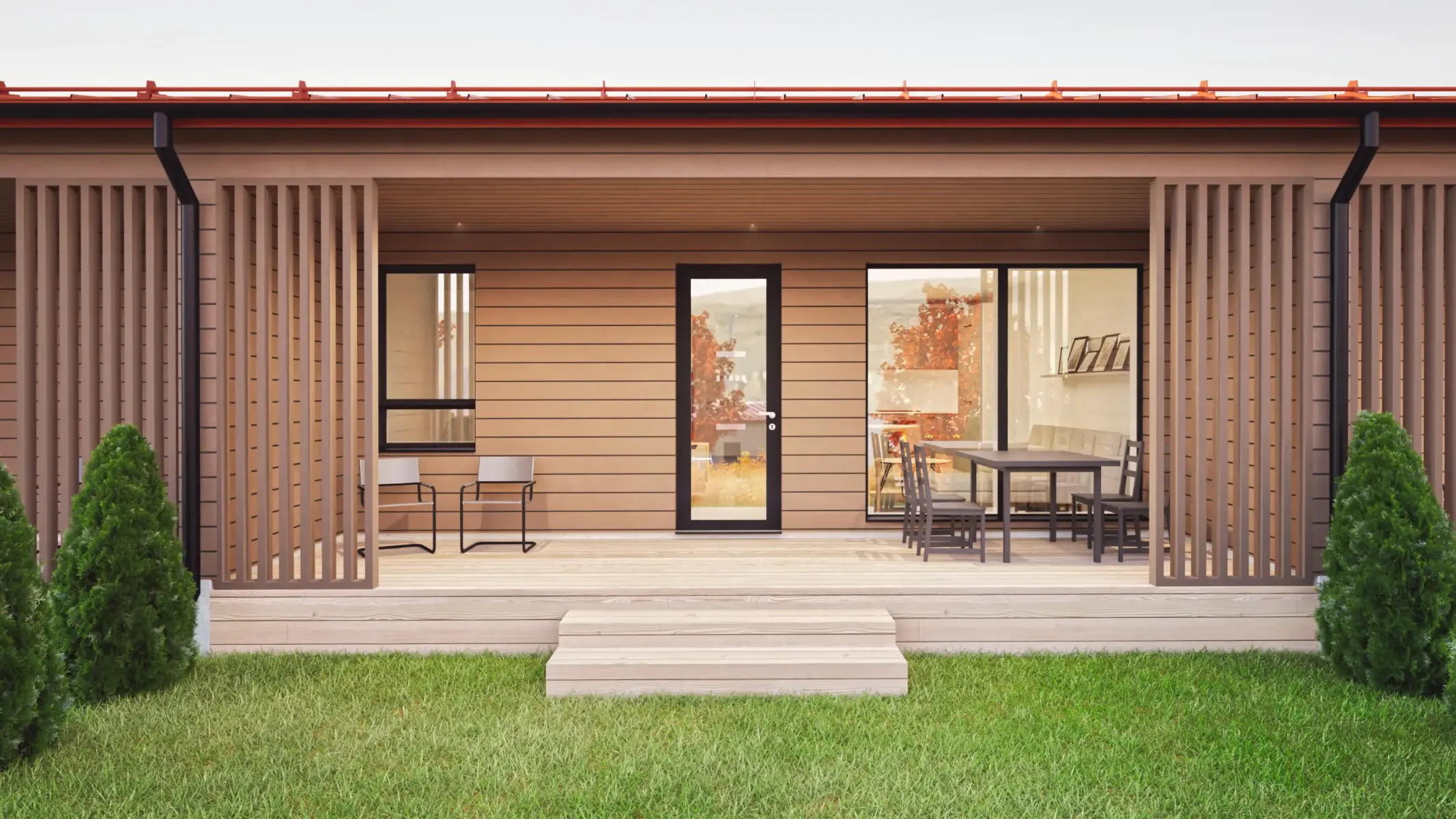 Rakennukset koostuvat 66 m2 kolmioista ja 72 m2 neliöistä, jotka aukeavat rakennusten keskelle muodostuvalle yksityiselle oleskelupihalle.